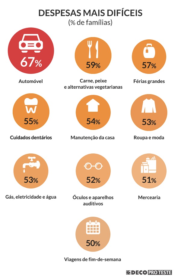 Cerca de três quartos (74%) das famílias enfrentam, mensalmente, dificuldades financeiras, sendo que 8% se encontram em situação crítica: têm dificuldade em pagar todas as despesas ditas essenciais (mobilidade, alimentação, saúde, habitação, lazer e educação). As principais parcelas que geram constrangimentos na gestão orçamental dos consumidores dizem respeito às despesas com o carro – combustíveis, manutenção e seguros (67%) –, alimentação – carne, peixe e alternativas vegetarianas (59%) –, férias grandes – viagens e estadias (57%) –, cuidados dentários (55%) e manutenção da casa – obras, remodelações (54%). “Os resultados de 2022 não são animadores”, considera, Rita Rodrigues, Diretora de Comunicação e Relações Institucionais da Deco Proteste. E acrescenta que “é constatável que não houve uma melhoria efetiva das condições de vida dos portugueses nos últimos anos, e as consequências da guerra na Ucrânia puseram a nu todas as fragilidades da nossa economia e a debilidade económica da maioria dos agregados familiares”.
