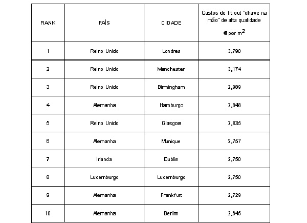 Tabela: Os 10 locais mais dispendiosos para um fit out de alta qualidade na Europa