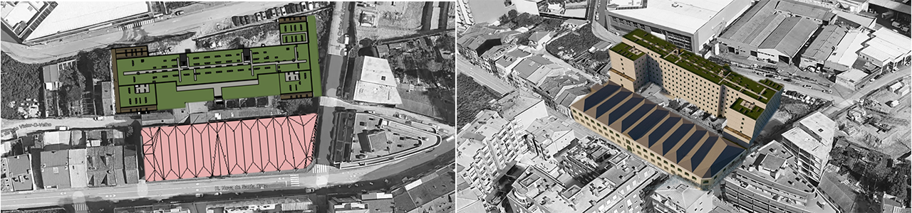 Para melhor interligação da proposta com o espaço público será criada um praça central, repondo o traçado da antiga Rua do Pulo, arruamento que permite a “individualização” dos dois edifícios, salvaguardando o património classificado na sua configuração.