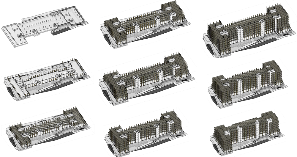 Deste respeito e adaptabilidade do programa pela modularidade e métrica do sistema construtivo, resulta uma dinâmica entre pisos, mas de igual modo, uma dinâmica no sentido evolutivo de cada tipologia, ou seja, cada uma pode evoluir de forma modular em relação a outra, tentando manter a continuidade espacial dos compartimentos interiores, mas também, um coerente alinhamento vertical, que possa garantir o correto funcionamento técnico dos mesmos (courettes técnica ou racks).