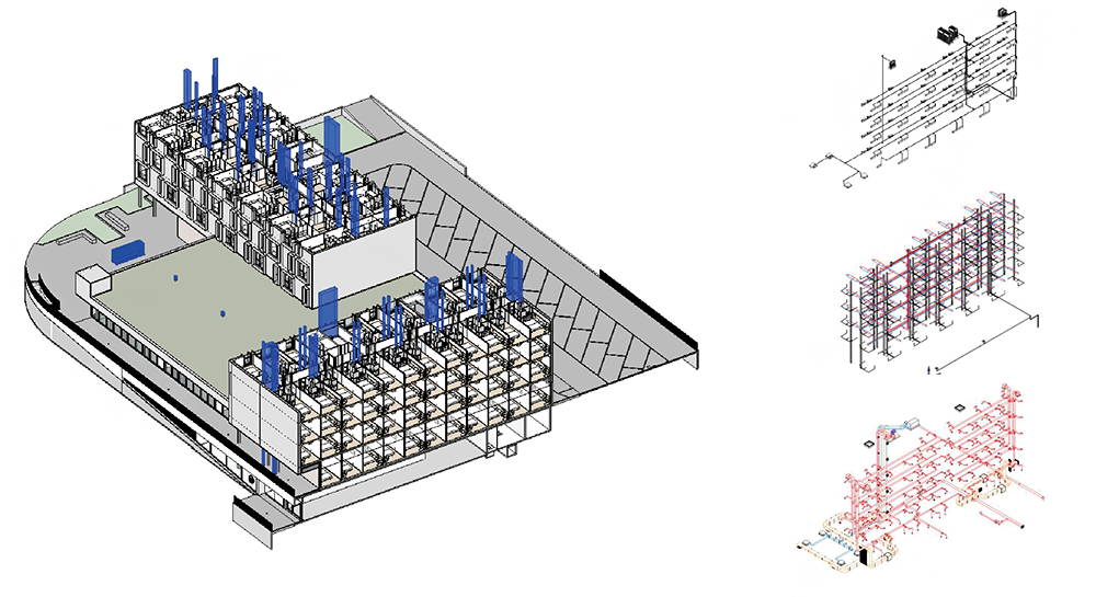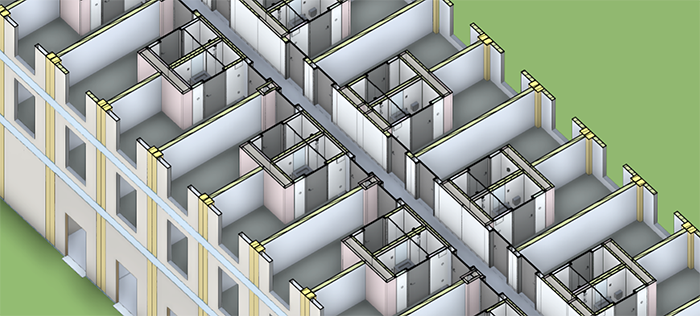 Neste projeto, os módulos habitacionais desenvolvidos, tiveram em consideração, não apenas o modulo estrutural das lajes e fachada Cree, mas também, todas as componentes técnicas, incorporadas num núcleo central, projetado para total industrialização, incorporando a casa de banho em “Pod 3D” e todas as condutas técnicas pré-fabricadas, com a integração de “rack vertical”. Deste modo potencializamos, não somente a prefabricação de módulos 3D das Instalações Sanitárias, mas igualmente, todas as componentes de suporte MEP, garantindo que a montagem de todas as componentes modulares em obra seja mais ágil, com minimização de erros, previamente coordenados em BIM e passiveis de uma prévia prototipagem.
