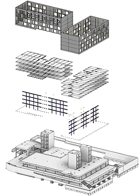 A componente estrutural do edifício, nomeadamente do novo, será construída com recurso a tecnologias inovadoras, priorizando sistemas modulares com elementos pré-fabricados, soluções de construção sustentável, caracterizada pelo uso híbrido de betão e madeira, múltiplos componentes construtivos industrializados, pré-fabricados offsite, nomeadamente o sistema estrutural e de fachadas, as instalações sanitárias, paredes divisórias industrializadas, os racks de instalações MEP e escadas pré-fabricadas. Esta abordagem mais industrializada, aliada à gestão especializada, traz toda uma matriz de eficiência, redução de desperdício, perceção e mitigação de problemáticas, que só são possíveis no contexto offsite e não no improviso característico da construção tradicional.