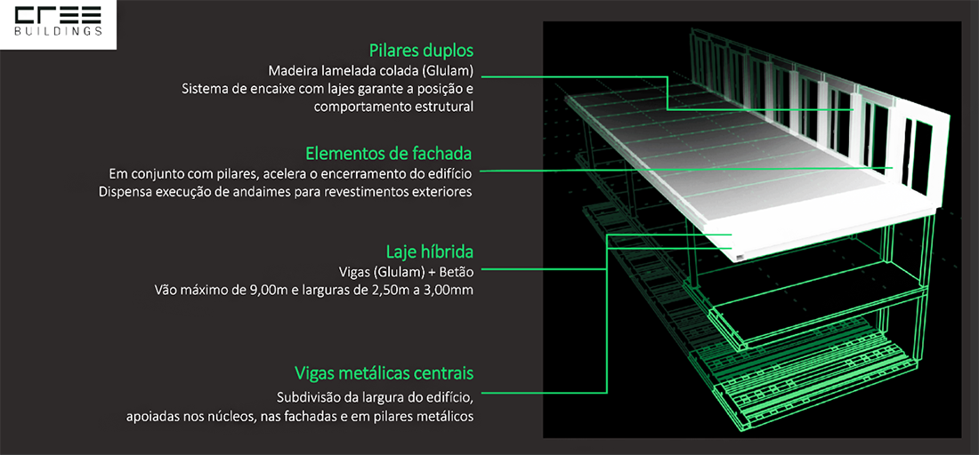 - Maior flexibilidade arquitetónica, onde a abordagem modular do Sistema Cree permite uma maior liberdade no desenho, especialmente na conceção de fachadas e espaços interiores. Os arquitetos podem escolher entre várias opções de métrica, tanto a nível de corte horizontal como vertical. Todos os componentes do sistema são famílias BIM interconectadas com um alto nível de detalhe, o que permite uma maior rapidez e eficiência no desenvolvimento do projeto;