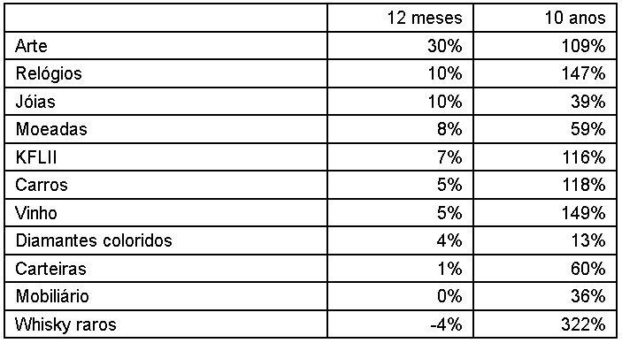 Seguem-se os diamantes coloridos, com um crescimento de valor de 4% e as carteiras a crescer 1%. Já o mobiliário está com um crescimento nulo a 12 meses (0%) e os Whisky raros a diminuírem pela primeira vez em vários anos (-4%), mas a manterem a mais forte valorização a 10 anos (322%).