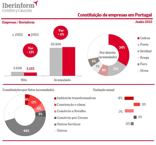 As constituições em Junho decresceram 13% de 3.608 empresas em 2022 para 3.133 em 2023 (menos 475 empresas constituídas). No total do primeiro semestre há um acréscimo de 6% face a 2022 com um total de 27.034 novas empresas constituídas.