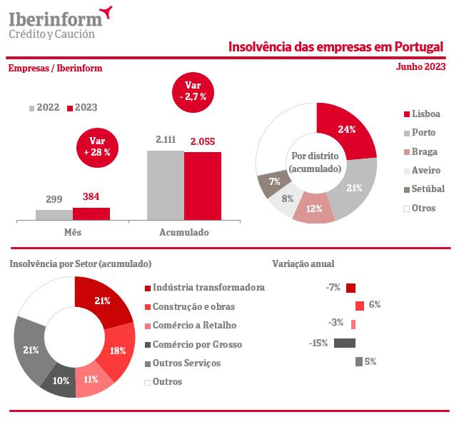 O mês de Junho de 2023 registou um aumento das insolvências, com 384 empresas insolventes, mais 85 que no período homólogo de 2022 (+28%). Contudo, o acumulado do ano ainda se mantém abaixo dos valores do ano passado (-2,7%), com um total de 2.055 insolvências.