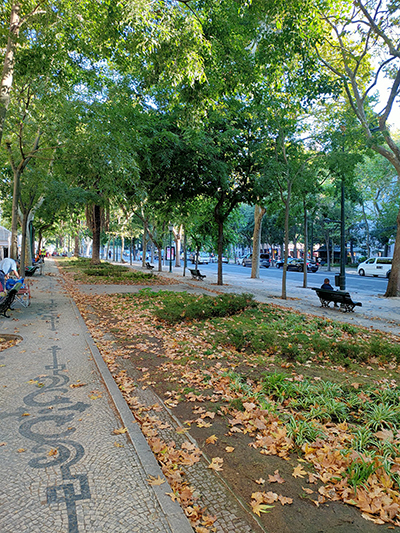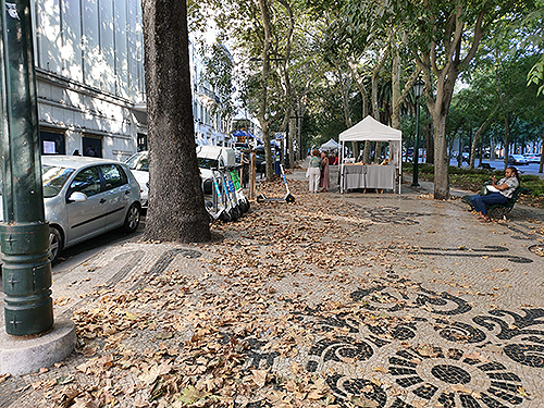 Às 09h30, surgem dois funcionários municipais munidos de sopradores de folhas secas. Àquela hora, quando o passeio já fervilha de gente, ligar o motor significaria levantar nuvens de pó sobre transeuntes e montras. Decidiram seguir avenida abaixo, talvez à procura de um ponto menos embaraçoso para trabalhar.