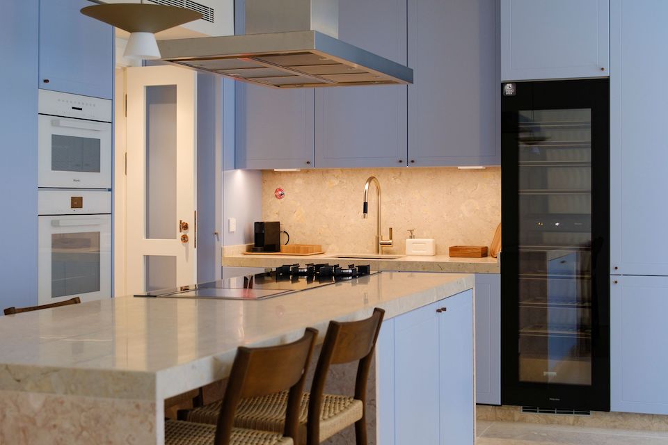 Assinado pela equipa da Entre Planos (arquitectura) e da Cellar Interiorismo (design e decoração), o projecto conjuga elementos arquitetónicos tradicionais, como tetos trabalhados em madeira, acabamentos em pedra lioz, escadas e soalhos em madeira, pormenores em cobre e portas e janelas clássicas; com soluções modernas e sustentáveis, como um sistema de domótica para maior eficiência energética, energia aerotérmica para climatização das águas. As cozinhas são totalmente equipadas com eletrodomésticos Miele.