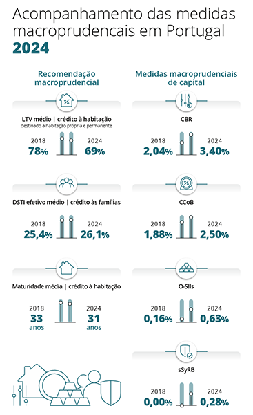 No segundo semestre de 2024, 27% dos novos créditos estavam próximos do limite do rácio LTV, 6% do limite da taxa de esforço e 2% no limite de ambos, contra 23%, 8% e 2%, respectivamente, no período entre o segundo semestre de 2022 e o primeiro semestre de 2024.