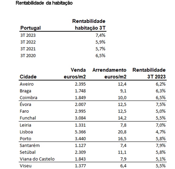 A rentabilidade habitacional mais baixa é obtida pelos proprietários das casas arrendadas em Lisboa (4,7%), Faro (5%), Viana do Castelo (5,1%), Funchal (5,5%) e Viseu (5,5%).