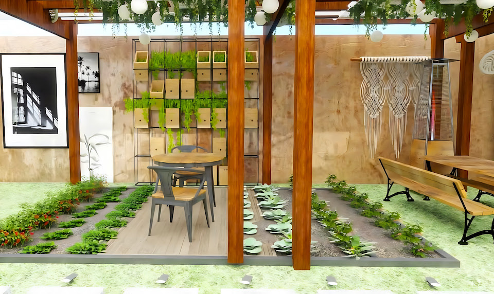 A sustentabilidade é um pilar central deste projecto: a madeira utilizada tem origem em excedentes industriais reciclados, a energia é gerada por painéis fotovoltaicos, a água da chuva é captada para irrigação/reaproveitamento sanitário e as linhas de nebulização asseguram conforto térmico nos meses mais quentes. O espaço integra ainda uma horta vertical e uma horta comunitária com ervas aromáticas e vegetais, o que reforça a ligação à natureza, promovendo hábitos mais saudáveis.