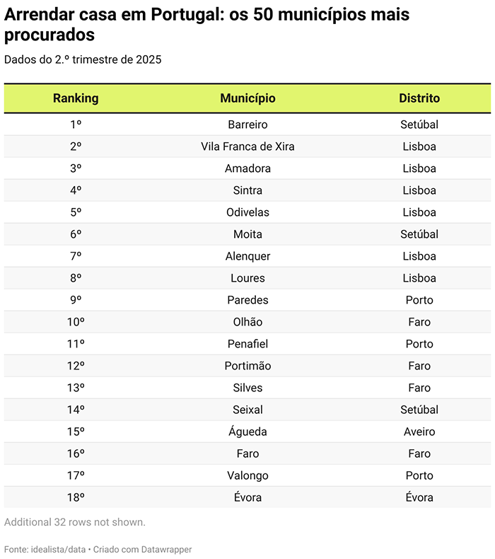 A procura por casas para arrendar em Portugal está a concentrar-se nos concelhos periféricos das grandes cidades, com destaque para a Grande Lisboa. No segundo trimestre de 2025, municípios como Barreiro, Vila Franca de Xira e Amadora lideraram o ranking dos 50 mais procurados, segundo dados do idealista/data. Lisboa e Porto, apesar de concentrarem a maior oferta de imóveis, ficaram fora do top – ocupando a 65.ª e 81.ª posições, respectivamente.
