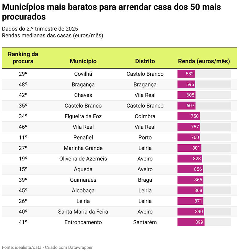 Entre os 50 municípios mais procurados, os preços oscilam entre os 582 euros (Covilhã) e os 1.778 euros (Palmela). A maioria tem rendas acima dos 1.000 euros, mas há 21 concelhos com valores inferiores a esse patamar – cinco deles com medianas iguais ou inferiores a 750 euros: Covilhã, Bragança, Chaves, Castelo Branco e Figueira da Foz.