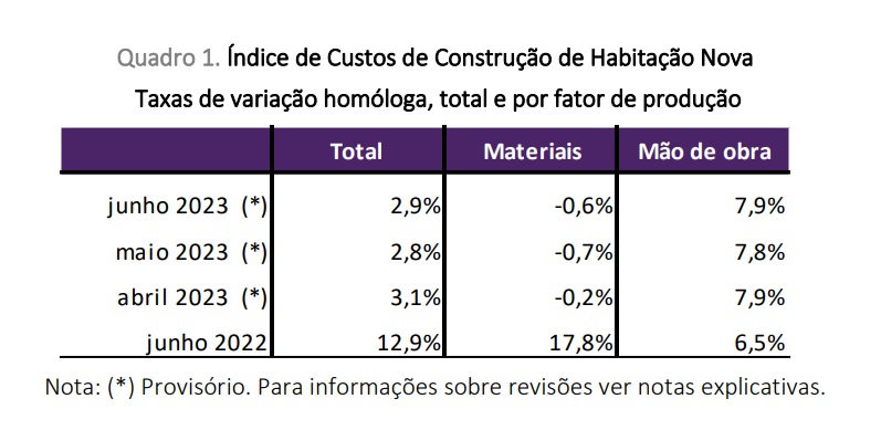 As componentes materiais e mão de obra contribuíram com -0,3 p.p. e 0,4 p.p., respetivamente, para a formação da taxa de variação mensal do ICCHN (-0,1 p.p. e 0,2 p.p. em maio, pela mesma ordem).