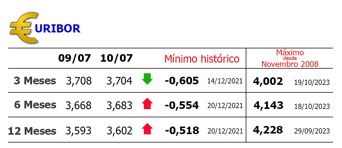 Com as alterações de hoje, as Euribor continuaram em valores muito próximos, mas a taxa a três meses, que recuou para 3,704%, manteve-se acima da taxa a seis meses (3,683%) e da taxa a 12 meses (3,602%).