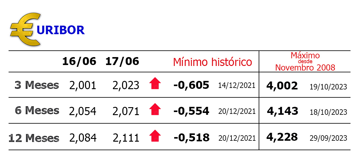 A Euribor a três meses, que esteve abaixo de 2% entre 30 de Maio e 12 de junho, subiu hoje para 2,023%, mais 0,022 pontos.