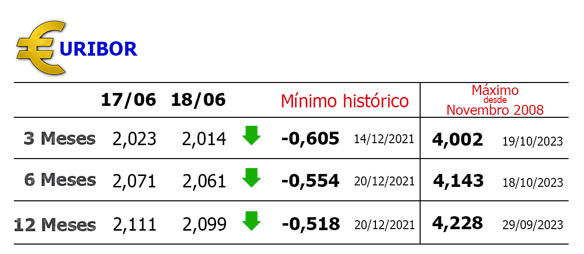 A Euribor a três meses, que esteve abaixo de 2% entre 30 de Maio e 12 de Junho, também baixou hoje para 2,014%, menos 0,009 pontos.