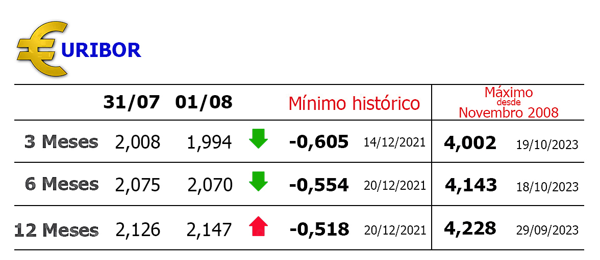 A média da Euribor em Julho subiu 0,002 pontos para 1,986% a três meses e 0,005 pontos para 2,055% a seis meses.