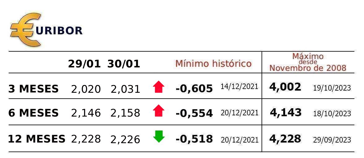 A média mensal da Euribor em Janeiro desceu 0,020 pontos para 2,028% a três meses e 0,002 pontos para 2,137% a seis meses. Já a 12 meses a média da Euribor recuou 0,022 pontos para 2,245% em Janeiro.