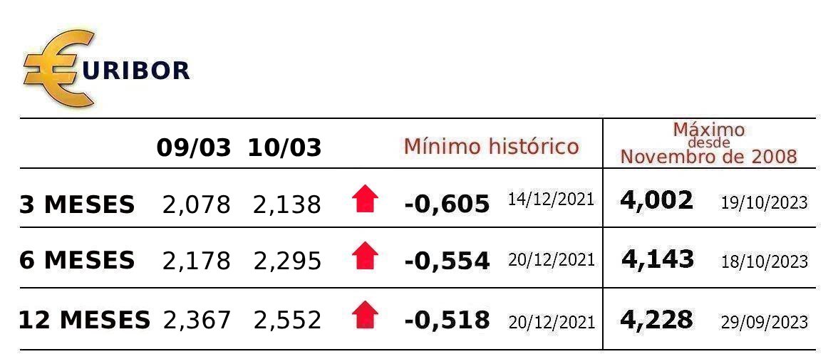 No mesmo sentido, a Euribor a três meses subiu hoje ao ser fixada em 2,138%, mais 0,060 pontos do que na segunda-feira.