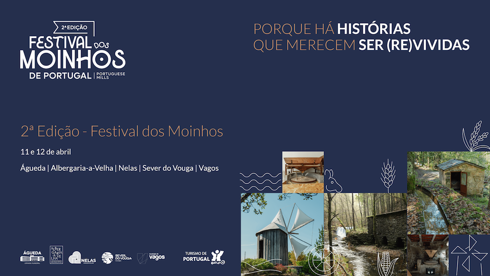 O Festival dos Moinhos de Portugal regressa nos dias 11 e 12 de Abril para a sua segunda edição, envolvendo cinco municípios, entre eles Águeda, Albergaria-a-Velha, Nelas, Sever do Vouga e Vagos, numa iniciativa apoiada pelo Turismo de Portugal que volta a colocar o património molinológico no centro da valorização cultural e turística do território.