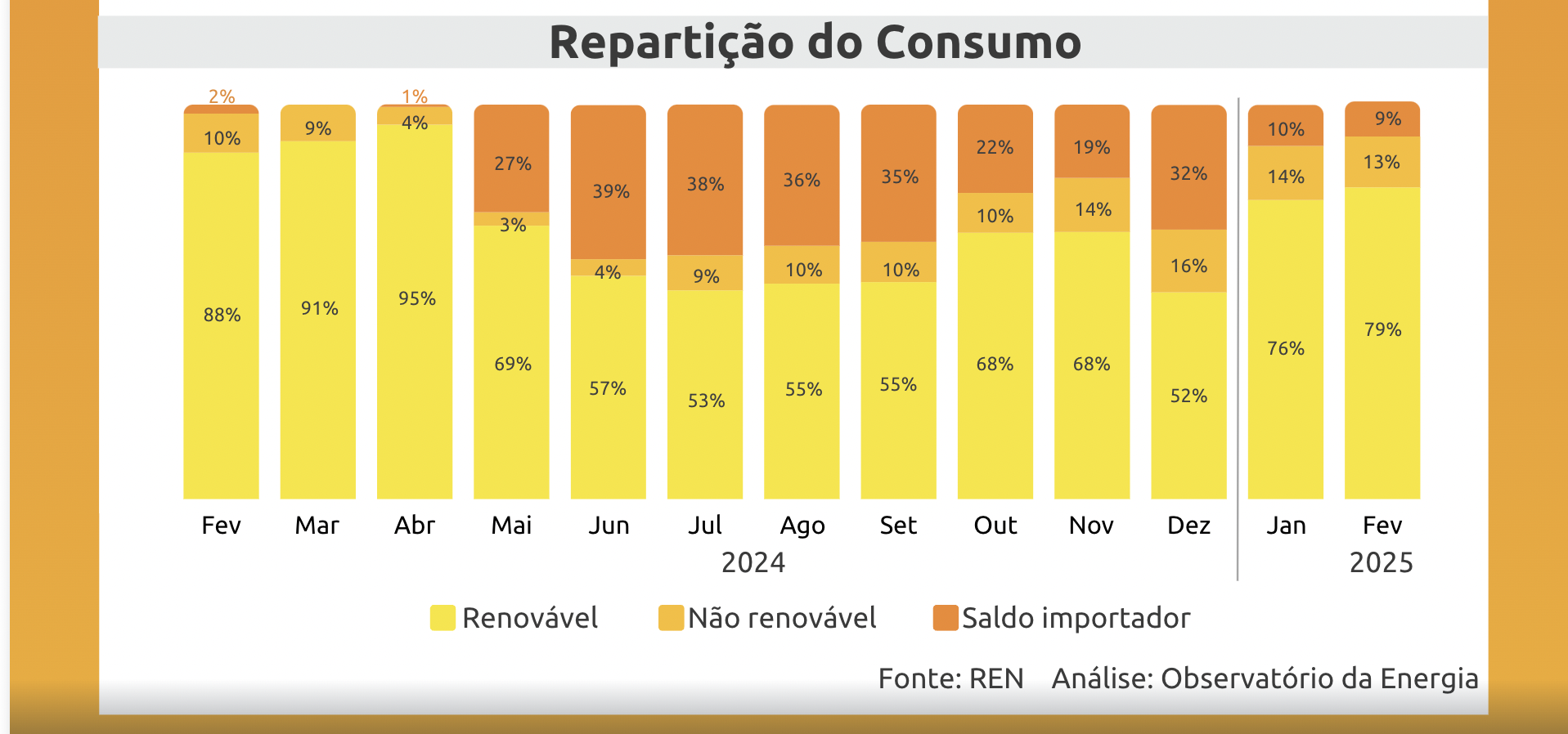 Segundo a REN, a produção renovável teve a seguinte repartição: hídrica 46,0%, eólica 20,3%, solar fotovoltaico 7,4% e a biomassa 4,8%.