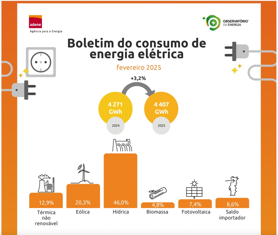 De acordo com a Agência para a Energia - ADENE, o consumo de electricidade aumentou 3,2% face ao mês homólogo e as energias renováveis abasteceram 78,5% do consumo de electricidade, as não renováveis 12,9% e o saldo importador 9%.