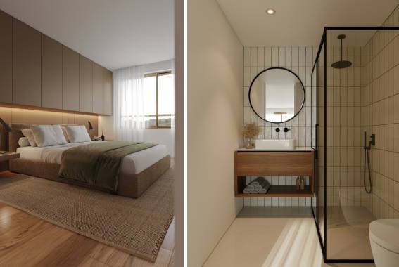 Os apartamentos estão equipados com ar condicionado, roupeiros embutidos nos quartos e cozinhas em open space com electrodomésticos encastrados, incluindo placa de indução, forno, micro-ondas combinado, frigorífico e máquina de lavar loiça.