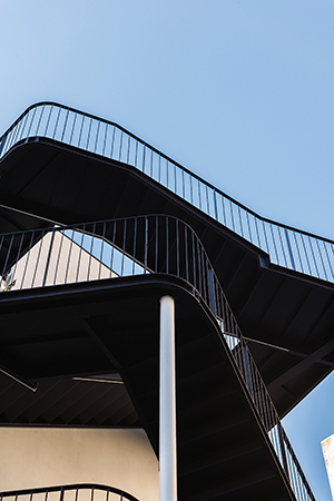 Essas galerias, rematadas nos topos por um novo corpo de escadas, asseguram também a circulação de emergência, permitindo a remoção das escadas e corredores interiores previamente existentes, optimizando o uso dos espaços.