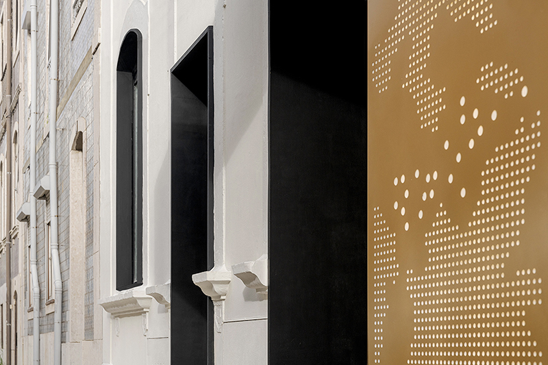 Entre os elementos mais marcantes da renovação estão o redesenho dos vãos, a utilização de novos materiais e a incorporação de painéis metálicos perfurados com padrões geométricos irregulares, conferindo à fachada uma identidade actual sem desvirtuar a memória do edifício.