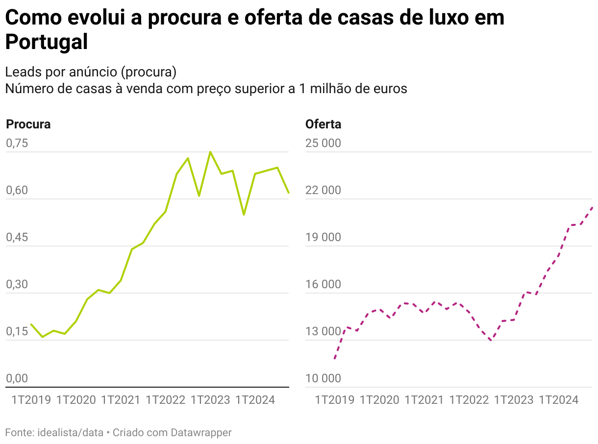 A análise do portal imobiliário indica que apesar de Lisboa, Porto e Faro concentrarem mais de metade da oferta, todos os distritos e ilhas portuguesas contam, pelo menos, com uma casa de luxo à venda. E tem-se assistido a cada vez mais habitações com preços acima de 1 milhão de euros a chegar ao mercado: contavam-se mais de 21 mil imóveis no final de 2024, mais 23% face há um ano e o maior valor registado desde 2019 no idealista/data.