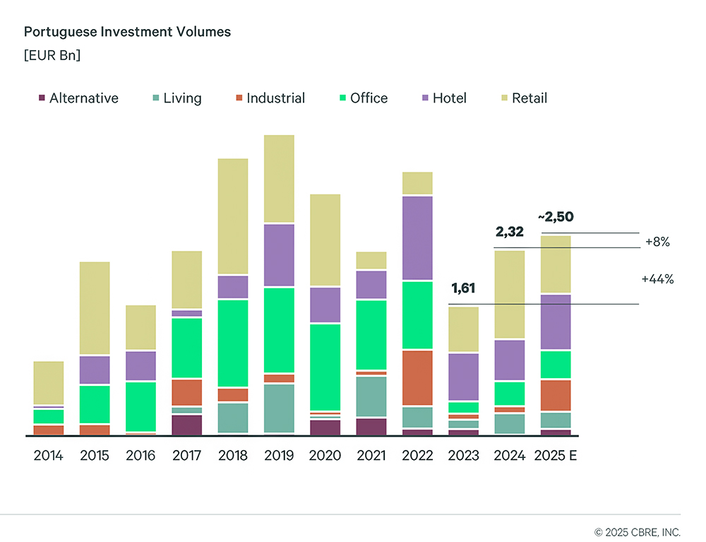 De acordo com o mais recente relatório Real Estate Market Outlook da CBRE, o mercado imobiliário português prepara-se para mais um ano de crescimento em 2025. A consultora prevê um crescimento de 8%, face a 2024, alcançando um volume de investimento de 2,5 mil milhões de euros.