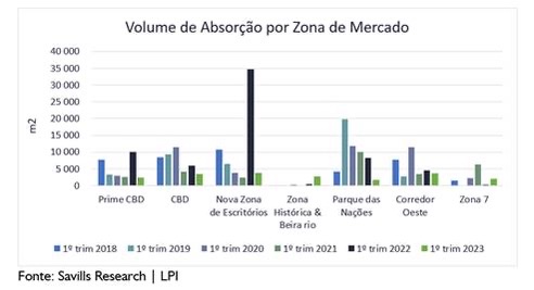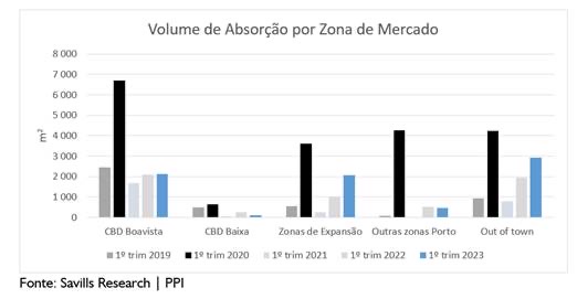 A Zona CBD Boavista registou a melhor performance do 1º trimestre de 2023 com um volume de absorção total de 2.124 m2, seguida da Zona Out of Town com 2.924 m2.
