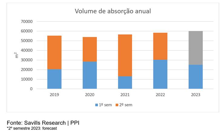Mas o maior aumento percentual de volume de absorção foi observado na Zona de Expansão com um aumento superior a 500% face ao mesmo período de 2022, justificado por ter sido palco da maior operação do semestre acima dos 5.000 m2.