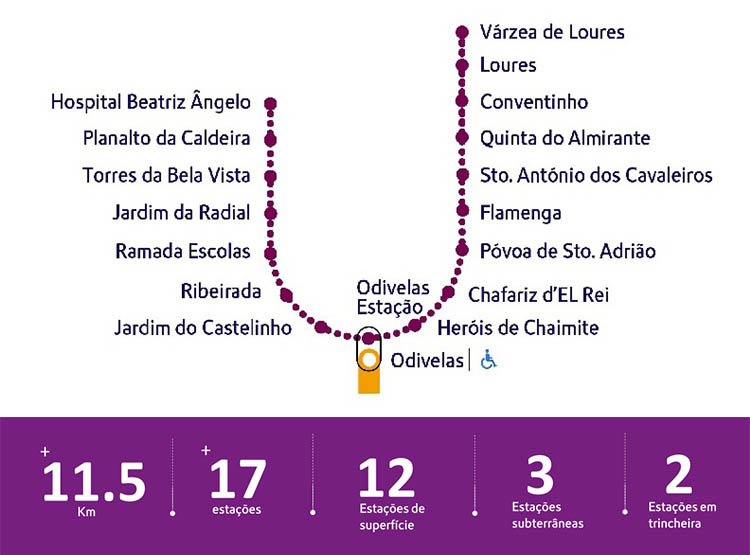 A Linha Violeta, com 11,5 quilómetros de extensão, contempla 17 estações: nove no concelho de Loures (que servirão as freguesias de Loures, Santo António dos Cavaleiros e Frielas, numa extensão de cerca de 6,4 quilómetros) e oito no concelho de Odivelas (para servir as freguesias de Póvoa de Santo Adrião e Olival de Basto, Odivelas, Ramada e Caneças), numa extensão total de cerca de 5,1 quilómetros.