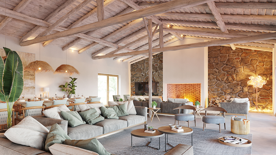 No seguimento das melhorias desenvolvidas, as sete suites originais passaram para oito e ligou-se a cozinha à sala, criando um open space e, por conseguinte, uma ideia de maior abertura e amplitude das divisões. Este pormenor levou a que o espaço da sala aumentasse de 90 m2 para 111 m2, o que somado ao espaço da cozinha dá um total de 135 m2. Foram ainda contempladas nesta pequena alteração, uma casa de banho social e uma garrafeira. Os elementos decorativos e arquitetónicos têm o cuidado de evocar uma linguagem minimalista em tons neutros, recorrendo a elementos naturais para esse efeito.