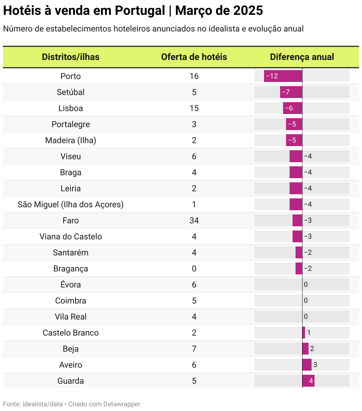Os distritos com mais estabelecimentos à venda foram Faro (34), Porto (16) e Lisboa (15), que juntos concentram metade do total. Ainda assim, os mesmos dados revelam que continua a haver oportunidades de negócio na hotelaria em praticamente todos os distritos e ilhas, uma vez que têm pelo menos um estabelecimento turístico disponível para vender. A única excepção é Bragança que não registou nenhum anúncio de hotel à venda neste período.