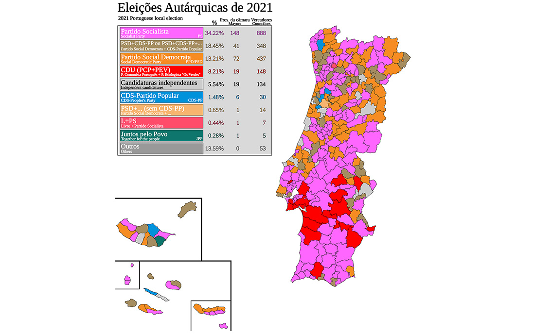 Nas últimas autárquicas, em 26 de Setembro de 2021, o PS foi a força mais votada quer nas câmaras municipais, quer nas juntas de freguesia: há 148 concelhos liderados pelo PS (mais um em coligação Livre+PS), 72 pelo PSD sozinho e 41 em coligação com o CDS-PP e outros partidos (além de mais um do PSD com outros partidos, mas sem o CDS-PP), 19 da CDU, 19 de movimentos independentes, seis do CDS-PP e uma do JPP.