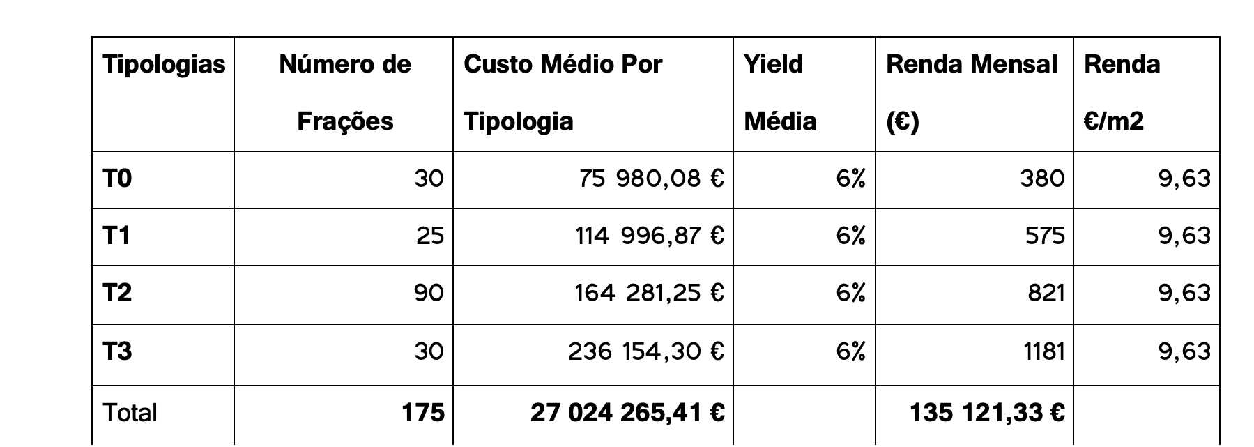Tendo em conta o custo de produçãodas tipologias descritas no “Programa 1”, se assumirmos uma Yield na ordem dos 6%, chegamos a uma renda unitária nos 9,63€/m2, que me parece bastante razoável.