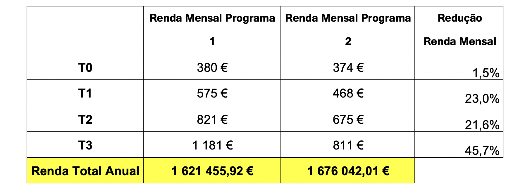 4) Reduzir rendas mensais por tipologia, aumentando ligeiramente a renda anual total.