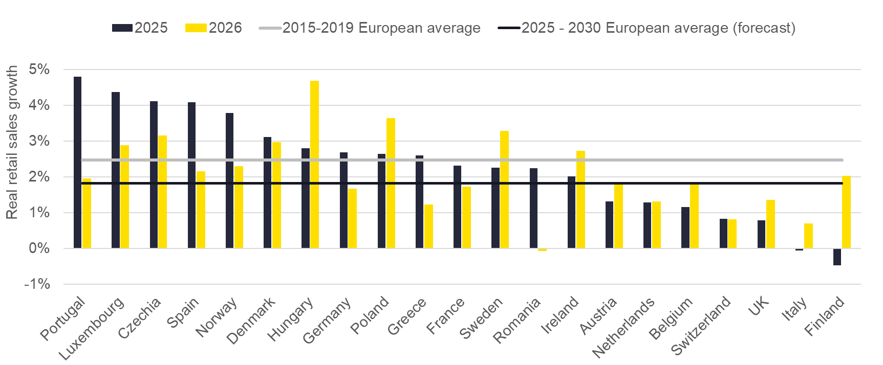 Após cinco anos marcados pelos efeitos da pandemia e por um crescimento médio de apenas 0,8%, a Savills estima uma expansão média real do retalho europeu de 2% em 2025, seguida de 1,7% em 2026 e 1,9% em 2027 – valores próximos dos níveis pré‑pandemia, num ambiente de maior estabilidade, mas com consumidores mais seletivos e focados na relação qualidade‑preço.