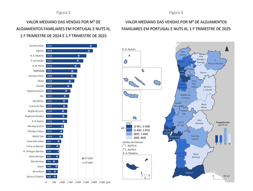 A subida dos preços foi transversal às 26 sub-regiões NUTS III (*), destacando-se o Alto Alentejo com um crescimento de 51,6%. As regiões com valores mais elevados mantêm-se: Grande Lisboa (3.183 €/m²), Algarve (2.929 €/m²) e Madeira (2.518 €/m²).