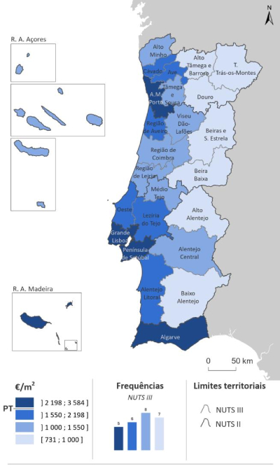Lisboa (5.198 euros/m²), Cascais (4.654 euros/m²) e Oeiras (4.225 euros/m²) continuam a liderar a tabela dos municípios mais caros.