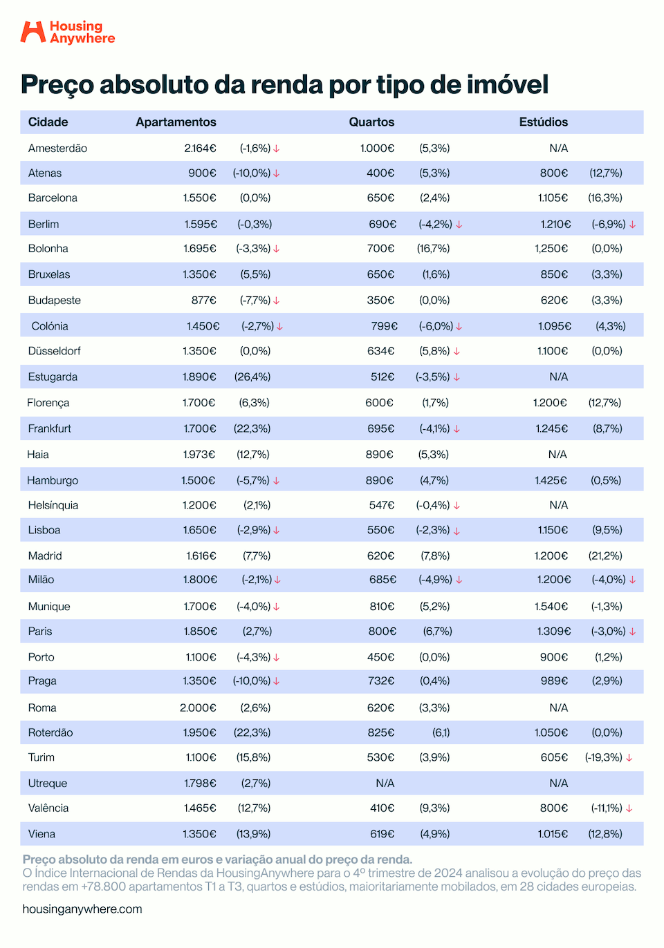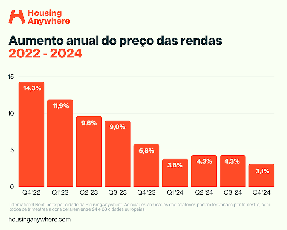 O HousingAnywhere International Rent Index by City para o 4º trimestre de 2024 revelou um aumento de 3,1% nos preços das rendas em toda a Europa face ao ano de 2023. Apesar deste aumento, a taxa de crescimento registada no 4º trimestre foi a mais baixa dos últimos anos.