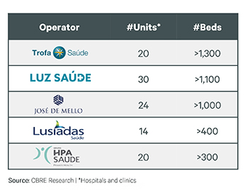 No âmbito da operação por privados, 35% do total das camas estão nas mãos de 5 principais operadores: Trofa Saúde, Luz Saúde, José de Mello, Lusíadas e Grupo HPA Saúde. Um dos motivos pelos quais se apresenta tão atractivo investir no sector dos cuidados de saúde prende-se com o rácio de cama por habitante pois se na Europa este rácio é de 5,3 camas por cada 1.000 habitantes, em Portugal situa-se nas 3,5 camas por 1.000 habitantes.