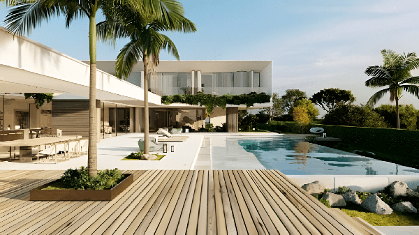 Um dos aspectos mais sedutores do design desta moradia é a sala, que conta com um envidraçado que abre completamente para dentro da parede, criando uma conexão única com o exterior, sendo a ligação entre a sala e a piscina uma extensão orgânica do espaço interior, com uma amplitude de 11 metros, proporcionando uma sensação de continuidade e harmonia entre a habitação e a natureza circundante.