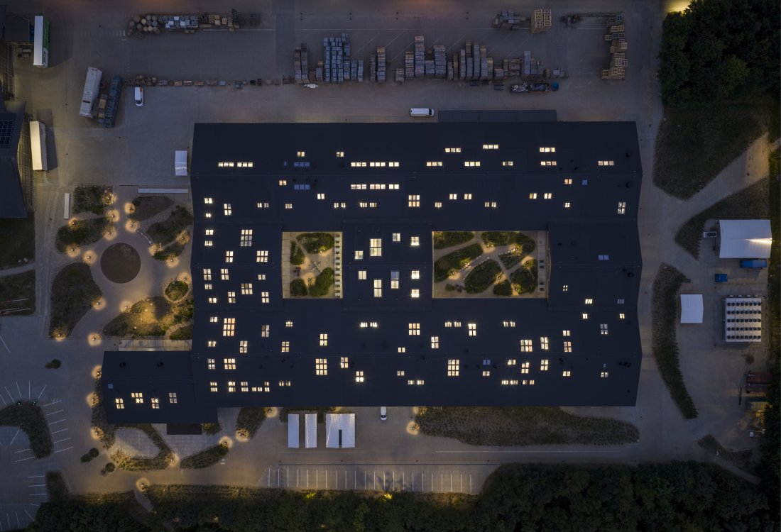 A antiga construção em madeira — projectada por Lars Kann-Rasmussen e mantida em excelente estado após três décadas — foi adaptada para acolher 500 trabalhadores das áreas de I&D, design de produto, testes laboratoriais e operações. O espaço integra escritórios, laboratórios e oficinas, permitindo desenvolver, prototipar e testar soluções sob o mesmo teto.