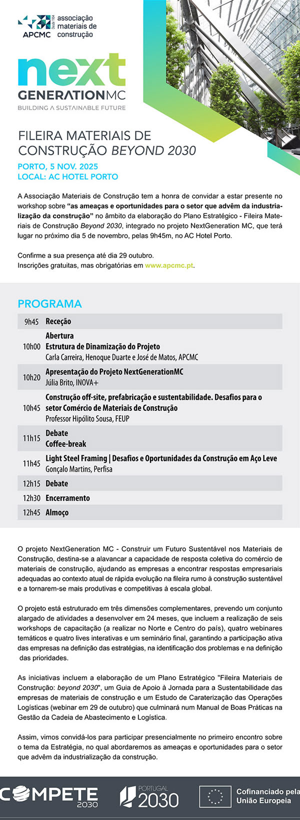 A apresentação do projecto NextGeneration MC ficará a cargo de Júlia Brito, da INOVA+, seguindo-se a intervenção do professor Hipólito Sousa, da Faculdade de Engenharia da Universidade do Porto - FEUP, sobre “Construção off-site, prefabricação e sustentabilidade: desafios para o sector do comércio e materiais de construção”.
