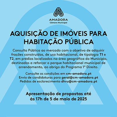 No âmbito da Estratégia Local de Habitação, o Município da Amadora, na Área Metropolitana de Lisboa, está a realizar uma Consulta Pública ao mercado com o objectivo de adquirir fracções habitacionais de tipologia T1 e T2, na área geográfica do município, destinadas a reforçar o parque habitacional municipal de arrendamento, ao abrigo do Programa 1º Direito.