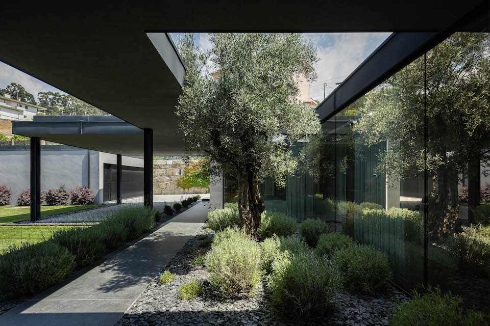 A encosta deu o nome e a ideia. O terreno desce suavemente em direcção à paisagem do Minho, e a casa acompanha esse movimento sem resistência, pousada sobre o solo com leveza, aberta ao jardim, transparente quando a vista merece. Não há gesto forçado. Há uma continuidade entre o que foi construído e o que sempre esteve ali, algo que só se consegue quando o projecto começa pela escuta, e não pela forma. Chegamos antes de entrar. O percurso de acesso tem um ritmo próprio , uma cobertura que acolhe e encaminha, uma oliveira que marca a passagem: do exterior que é de todos, para o mundo interior que é só nosso. Aqui, o corpo abranda, a respiração muda. É um detalhe que não se consegue fotografar, mas que também não se esquece. Na Casa da Encosta, a sala convida-nos a ficar. O espaço do jardim entra pelo vidro, a luz da tarde instala -se e ninguém tem pressa de sair. O corredor é o relógio natural da casa, sempre em movimento com a natureza, o vento, o céu que muda de hora a hora, do outro lado do vidro. A escada de madeira faz da subida uma pausa consciente, uma curva suave, com a naturalidade de um gesto antigo.
